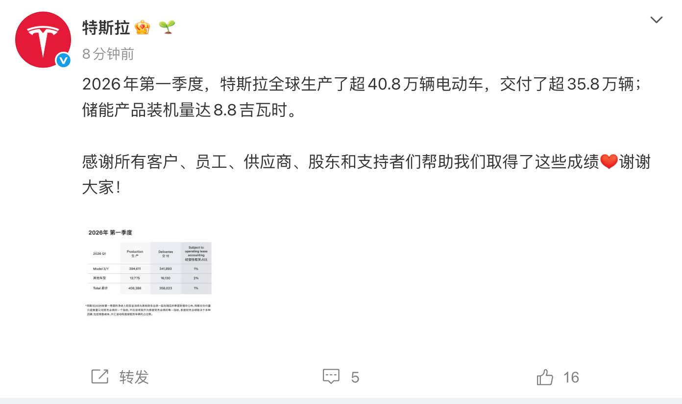 凤凰网科技讯 4月2日,特斯拉公布2026年第一季度产销数据。第一季度交付量358,023辆,同比增长6.3%,市场预估372,160辆。其中Model 3/Y 交付量341,893辆,同比增长5.6%,预估353,928辆。特斯拉第一季度汽车产量408,386辆,同比增长13%,预估388,169辆。