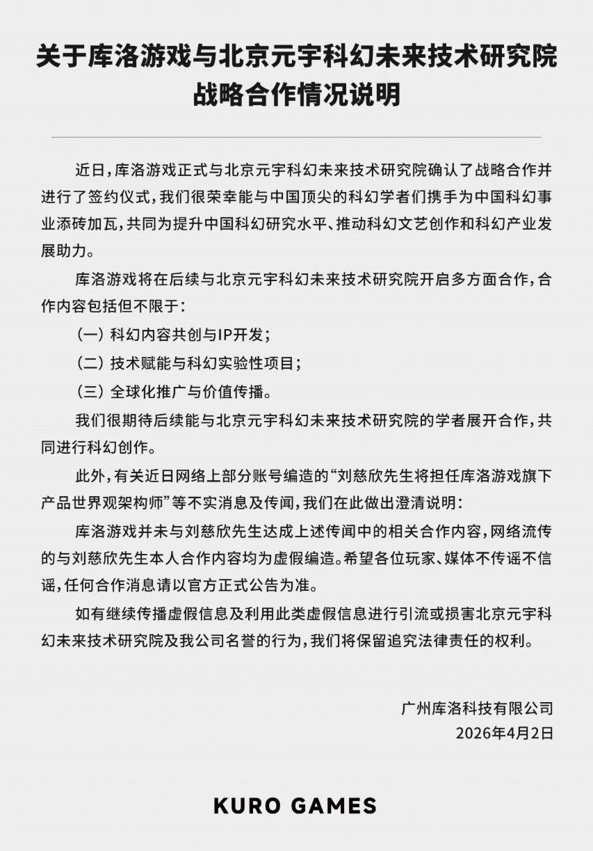 IT之家 4 月 3 日消息,4 月 2 日,库洛游戏发布《关于库洛游戏与北京元宇科幻未来技术研究院战略合作情况说明》。