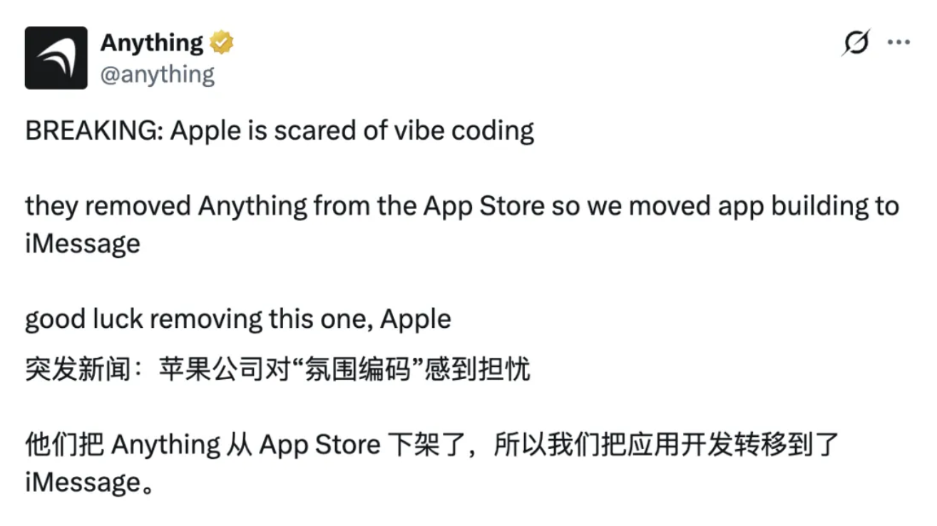 这说明苹果的判断,或许不只是某个具体功能有问题,而是认为这类产品的运行逻辑本身,就和 App Store 的审查模型存在根本冲突。即使代码预览发生在网页里,只要 Anything 这个 App 还在充当「生成并分发动态代码」的入口,苹果就认为它超出了审核范围。