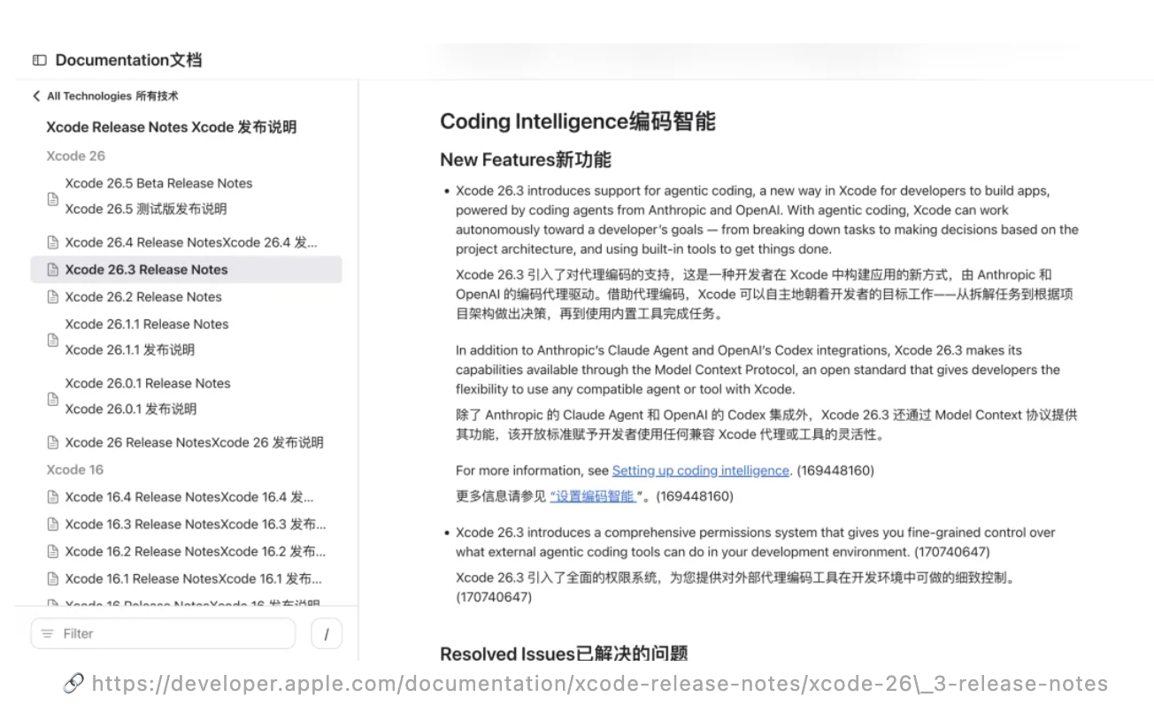今年 2 月推出的 Xcode 26.3,直接让 Claude Agent 和 OpenAI Codex 进了 Xcode,用来搜索文档、查看文件结构、更新项目设置、验证预览、自动迭代构建。