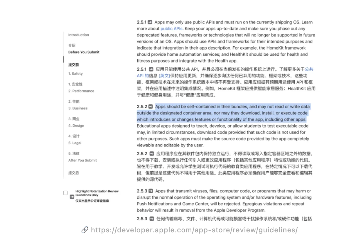 这条规则长期以来针对的,是那些用「热更新」走后门的开发者——应用上架后,偷偷往里塞新代码,绕过审核直接推送给用户。苹果一直明令禁止这种行为,因为一旦放行,审核制度就形同虚设了。
