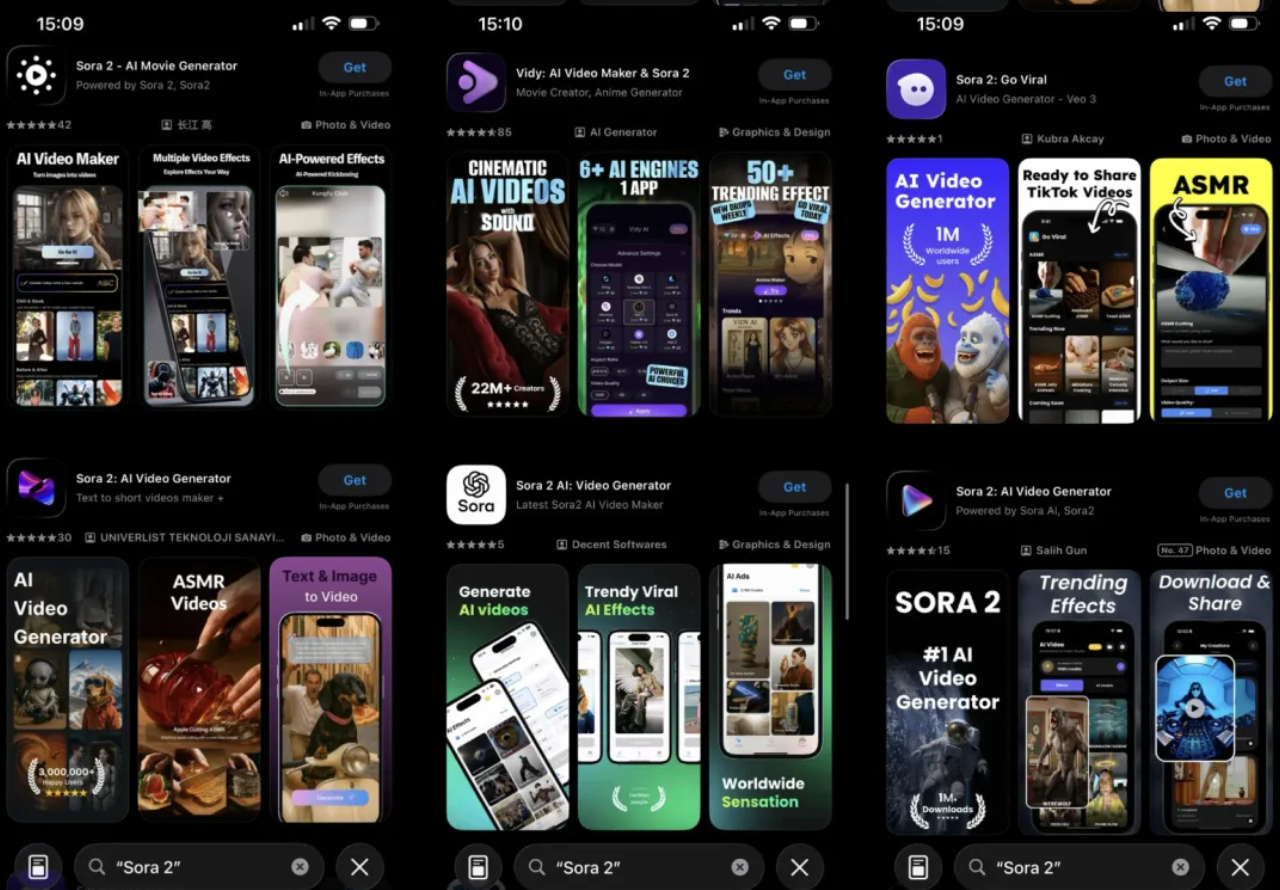 举个简单例子,去年 Sora APP 发布之后,App Store 就冒出了一大批山寨 Sora 应用,有的在图标里直接盗用 OpenAI 的官方标志,有的在副标题里挂上「Veo 3」蹭热度,全部指向一个目的,骗用户开高额订阅。