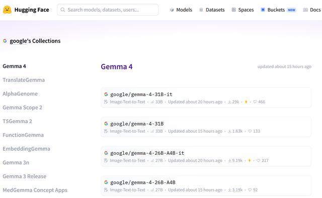Gemma 4官方模型集合页面(图源:Hugging Face)
