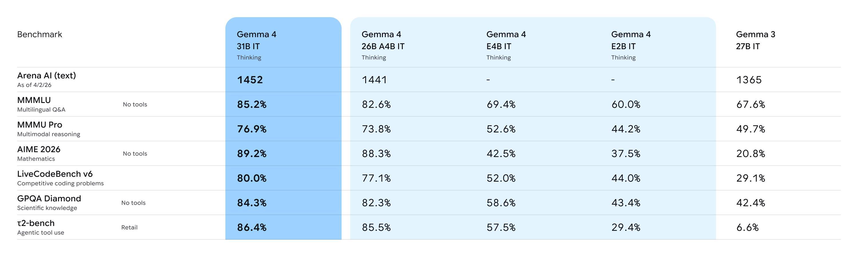 Gemma 4系列模型在多项基准测试中的表现对比(图源:blog.google)