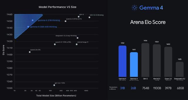 Gemma 4 在Arena用户偏好排行榜中的参数量对比(左)与用户偏好(右)(图源:blog.google)