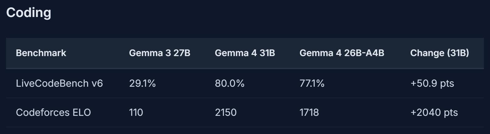 尤其在编程能力上,Gemma 4的Codeforces ELO评分相较上一代Gemma 3的110分(接近勉强可用水平),大幅提升至2150分(接近竞技编程专家级)。