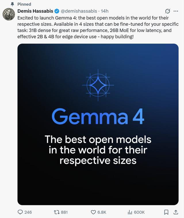 谷歌DeepMind CEO德米斯·哈萨比斯(Demis Hassabis)将Gemma 4称为“在各自参数量级下性能最优的全球开源模型”。