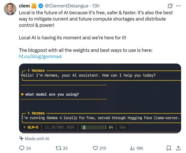 Hugging Face联合创始人克莱门特·德朗格(Clément Delangue)将Gemma 4模型发布视为“本地AI正在迎来关键发展阶段”,并认为开放模型与可本地部署能力将成为未来AI的重要方向。
