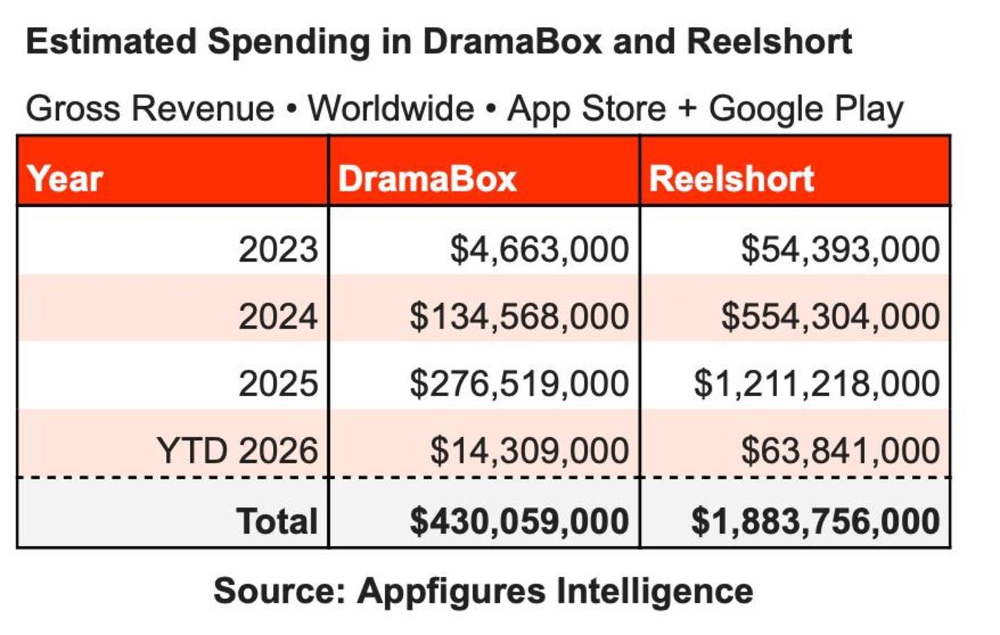 据应用市场调研公司Appfigures预测,ReelShort预计2025年的总收入将达到12亿美元,同比增长119%;DramaBox的2024年收入预计也将翻一番,达到2.76亿美元。