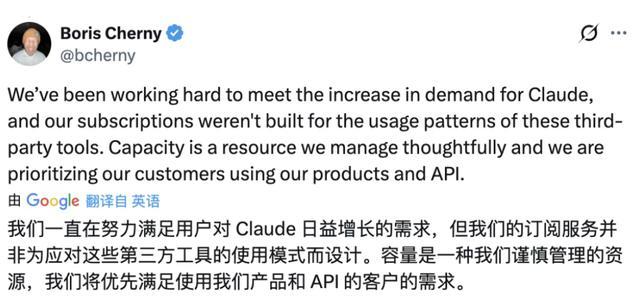 他提到,Anthropic一直在努力应对Claude需求的增长,而其订阅服务,本来就不是为第三方工具的使用模式设计的。算力是需要审慎管理的资源,Anthropic要优先保障使用自家产品和API的客户。