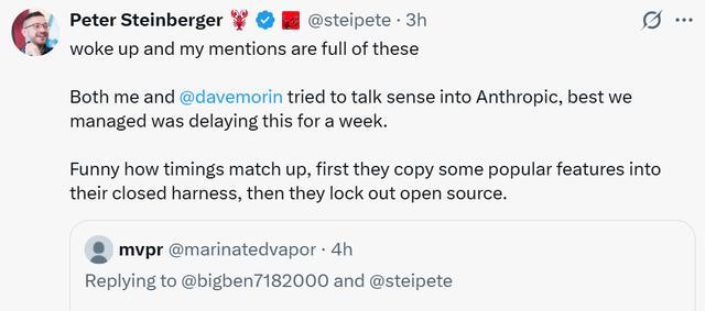 他感慨,时间点真是巧合,Anthropic先是将一些流行的功能复制到他们的封闭框架中,然后又把开源软件拒之门外。