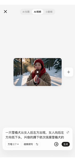 千问支持对已有内容进行自然延展,能将 2 秒视频最长续写至 15 秒。你只需上传一小段已有视频,就能一键生成后续内容。
