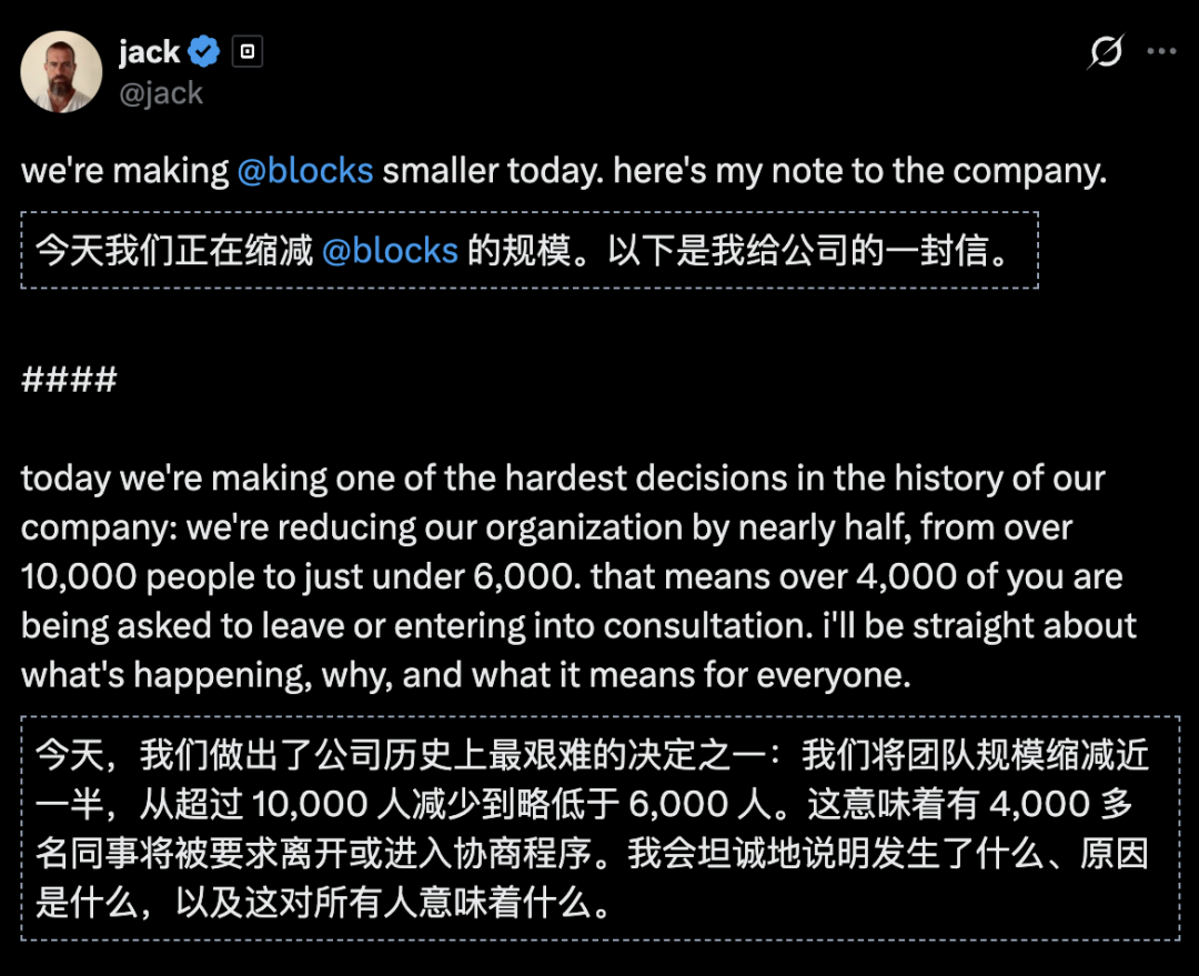 硅谷支付巨头Block创始人Jack Dorsey一封全员信,一刀砍掉40%+的员工