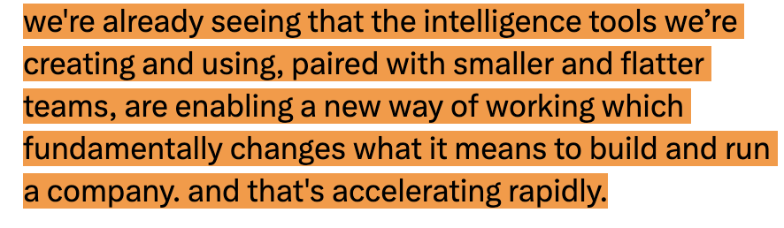 公开信辩称:「我们正在看到,我们所创建和使用的智能工具,配合更小、更扁平化的团队,正在催生一种全新的工作方式,从根本上改变了构建和运营一家公司的含义」。