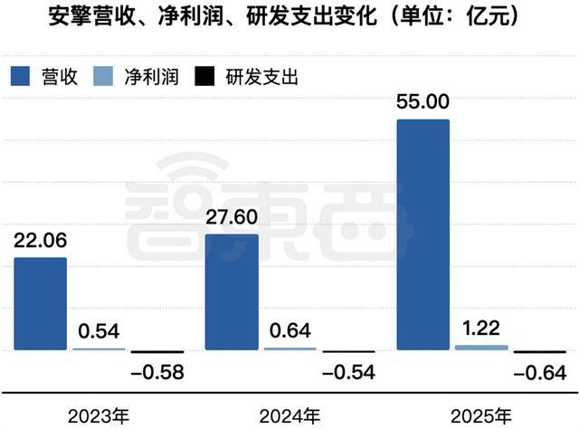 2023年、2024年、2025年,安擎收入分别为22.06亿元、27.60亿元、55.00亿元,净利润分别为0.54亿元、0.64亿元、1.22亿元,研发费用分别为0.58亿元、0.54亿元、0.64亿元,综合毛利率分别为10.1%、8.8%、6.0%。