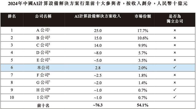 根据弗若斯特沙利文的资料,按2024年收入计,安擎为中国第六大AI计算设备解决方案提供商,市占率为2.0%,也是中国AI计算设备解决方案行业中最大的独立公司。