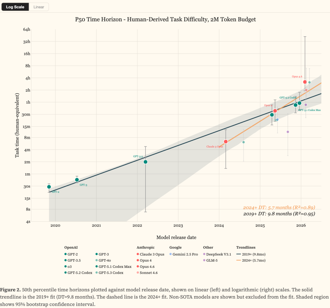 前沿模型现在在那些人类专家需要10.5小时才能完成的任务上,已有50%的成功率。