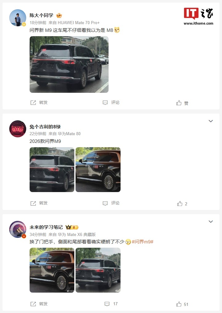IT之家 4 月 6 日消息,据多位博主今日分享,鸿蒙智行 2026 款问界 M9 无伪装实车已现身街头。
