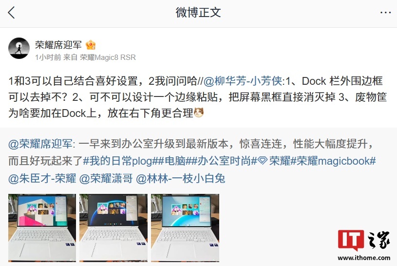 荣耀全场景软件主理人 @荣耀席迎军 进行了解答,称 1 和 3 可以自己结合喜好设置,2 需要再问问。这表明 MagicBook 全新 AI UI 的 Dock 栏外观 / 功能支持自定义。