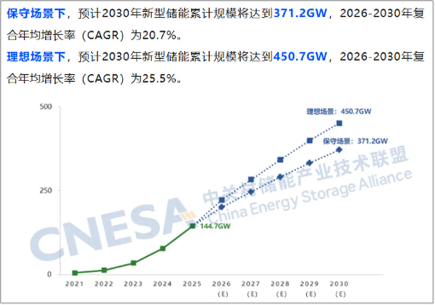 中国新型储能累计投运装机规模预测(2026-2030年)