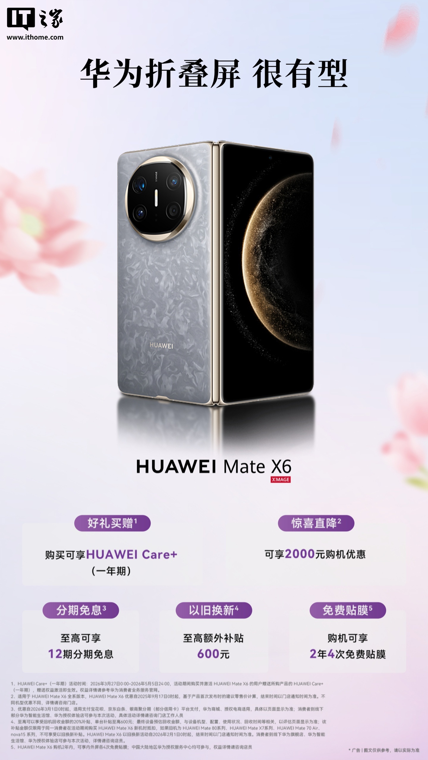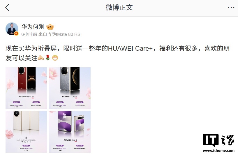 IT之家 4 月 6 日消息,华为终端 BG 首席执行官何刚今日公布了华为折叠屏最新限时购机权益,含 2 年 4 次免费贴膜、1 年 HUAWEI Care+ 等。