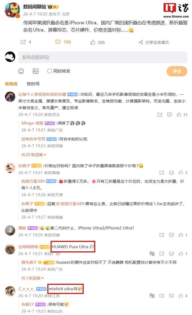 IT之家 4 月 7 日消息,博主 @数码闲聊站 今日发文称,传闻苹果阔折叠命名是 iPhone Ultra。他透露,国内厂商的阔折叠手机也在考虑跟进,新折叠暂命名 Ultra,屏幕形态、芯片硬件、价格全面对标。