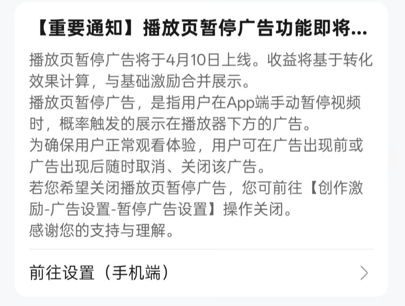 B站视频播放页暂停广告官宣4月10日上线 凤凰网科技讯 4月8日,哔哩哔哩(B站)宣布,将于4月10日上线播放页暂停广告。播放页暂停广告,是指用户在App端手动暂停视频时,概率触发的展示在播放器下方的广告。为确保用户正常观看体验,用户可在广告出现前或广告出现后随时取消、关闭该广告。 根据网友晒出的设置页面,播放页暂停广告并不是直接覆盖到视频之上,而是在视频下方显示,明确写有“广告”小字,用户可通过点击“X”号关闭。 此前,哔哩哔哩官方宣布,4月1日0时起,B站将下线猜你喜欢算法,不再根据用户的喜好来推荐主页内容,并上线推荐新算法。 Published by 风君子 独自遨游何稽首 揭天掀地慰生平 View all posts by 风君子