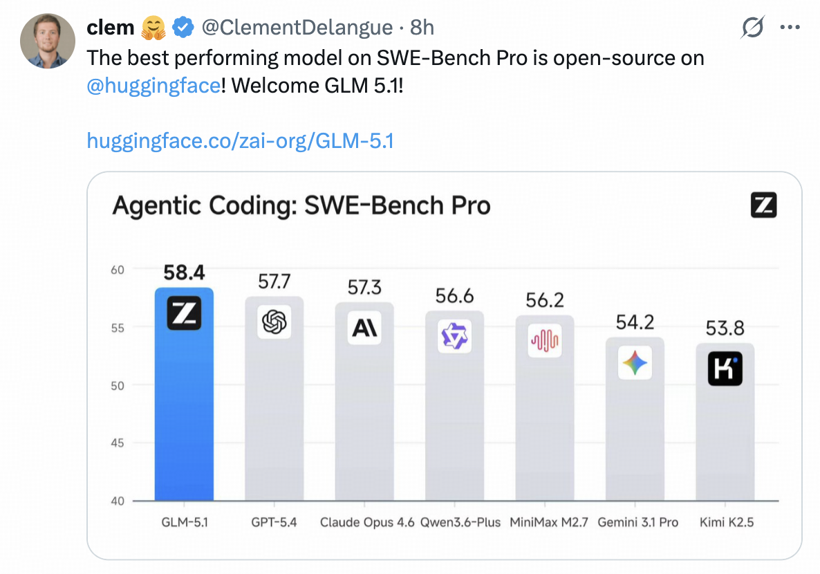 GLM-5.1 SWE-bench Pro 得分 58.4%,超过 Opus 4.6 的 57.3%,也超过 GPT-5.4 的 57.7%。HuggingFace CEO Clement Delangue 也发推祝贺:「SWE-Bench Pro 上表现最好的模型现在在 HuggingFace 上开源了!欢迎 GLM 5.1!」
