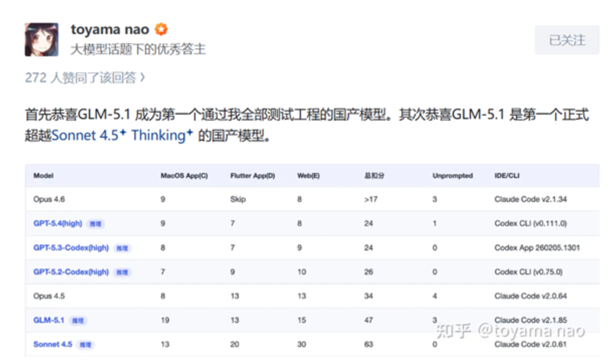 结果 GLM-5.1 成为第一个通过他全部测试工程的国产模型,也是第一个正式超越 Sonnet 4.5 Thinking 的国产模型。