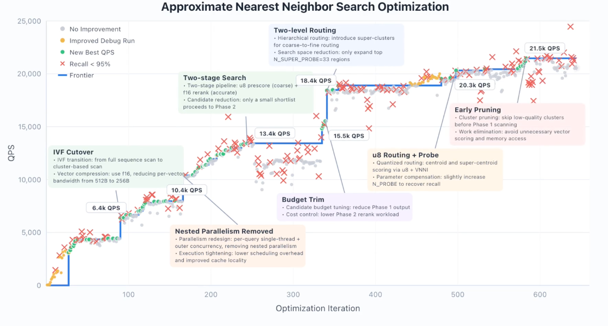 这个过程中,模型自己完成了从全库扫描切到 IVF 分桶召回、引入半精度压缩、加入量化粗排、做两级路由,再到提前剪枝的整套优化链条。每一次跳跃都伴随着短暂的 Recall 下降,因为模型在探索新方向时会暂时打破约束,随后再调回来。这个「打破-修复」的循环本身就是有效优化的标志。