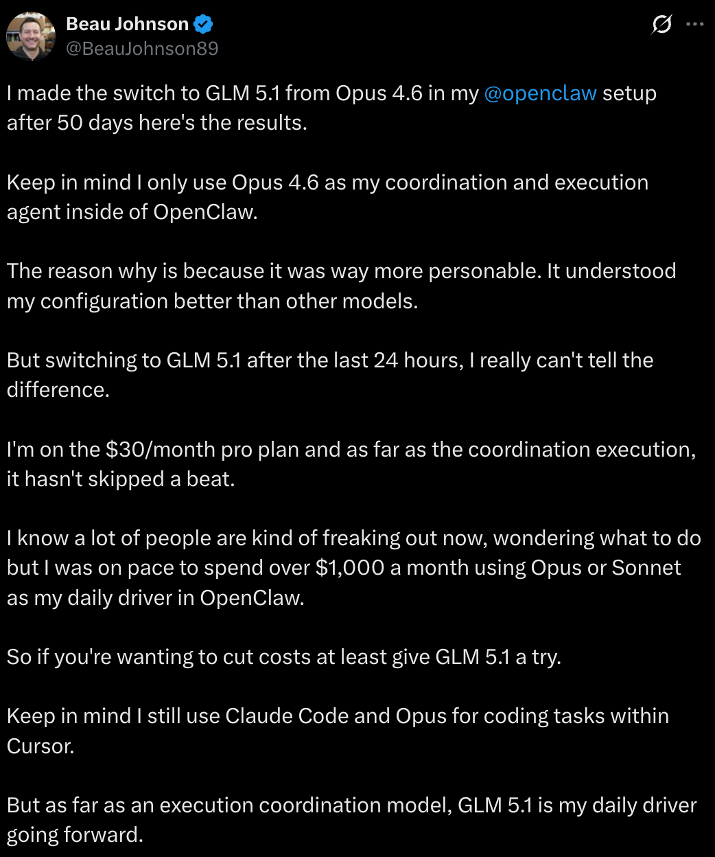 开发者 Beau Johnson 把自己部署的 OpenClaw 背后的模型从 Claude Opus 4.6 切换到 GLM-5.1,体验上没有任何差别,但成本从 1000 美元暴砍至 30 美元左右,降低了 97%。GLM-5.1 的输入成本是 Claude Opus 的 1/5,输出成本是 1/8。简单来说:接近 Opus 的能力,20% 的价格。