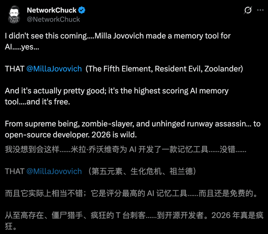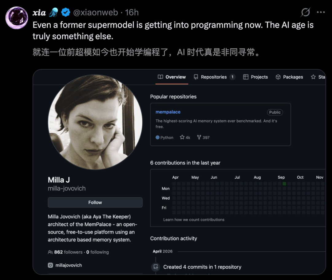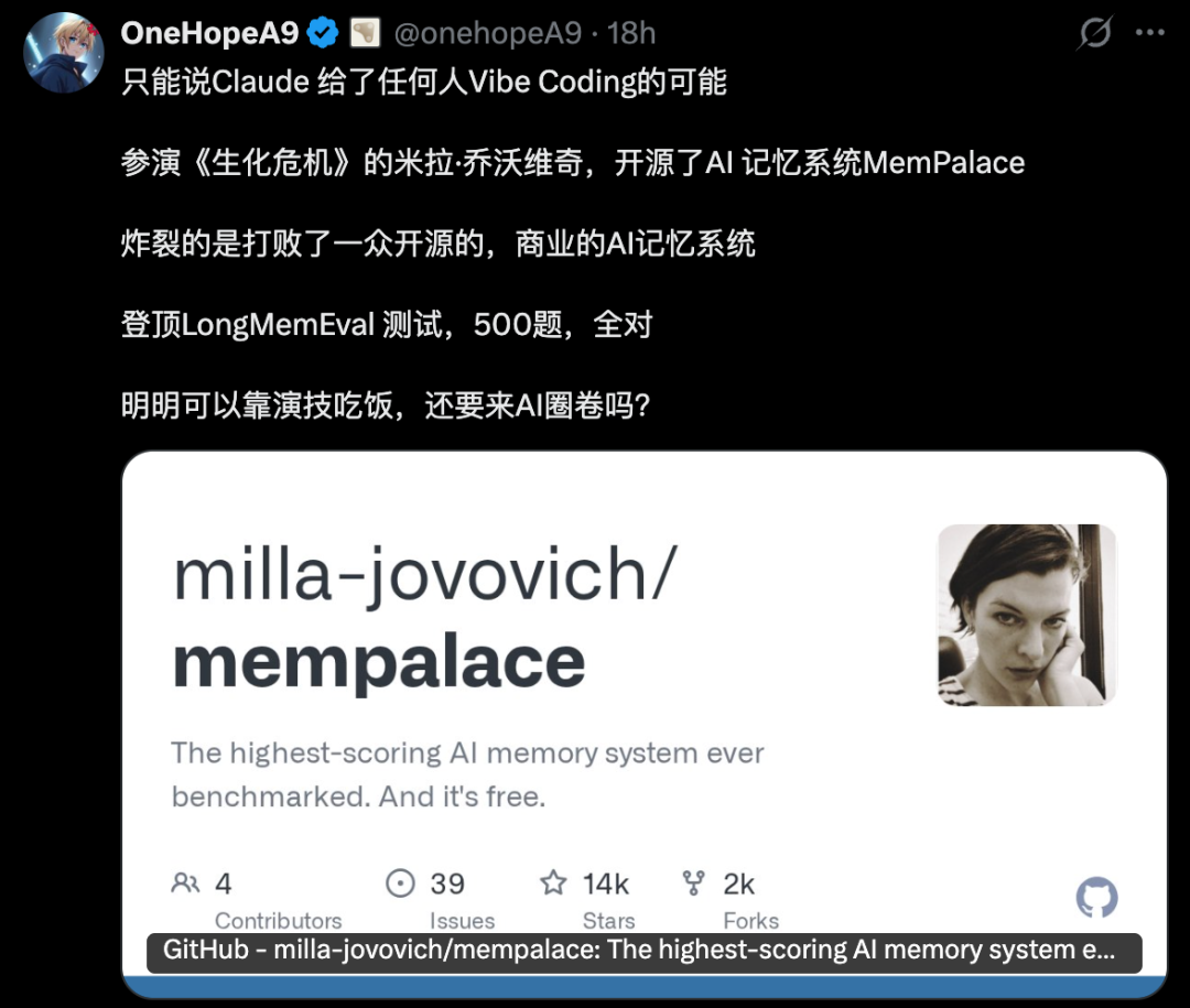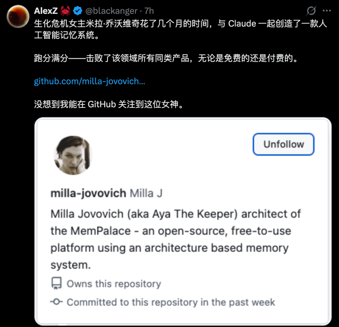 GitHub地址:https://github.com/milla-jovovich/mempalace