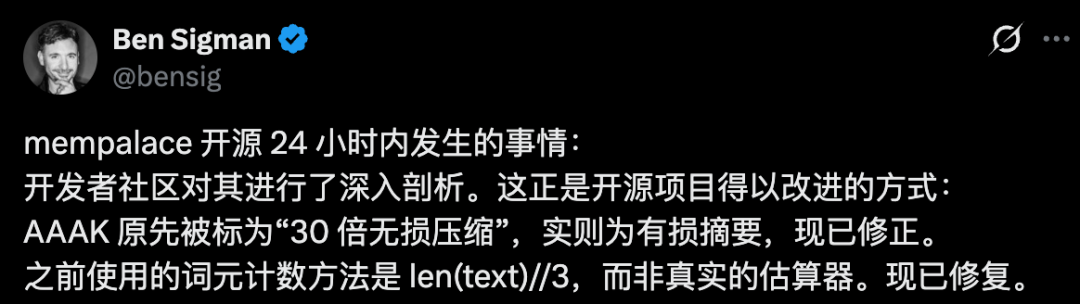 「30倍无损压缩」,承认夸大改口为「有损缩写系统」。「+34%宫殿增益」承认措辞误导,补充说明是标准元数据过滤。