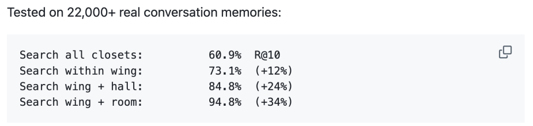 官方在22,000+条真实对话记忆上测试,全库搜索召回率60.9%,加上翼楼+房间过滤后直接拉到94.8%,提升34个百分点。