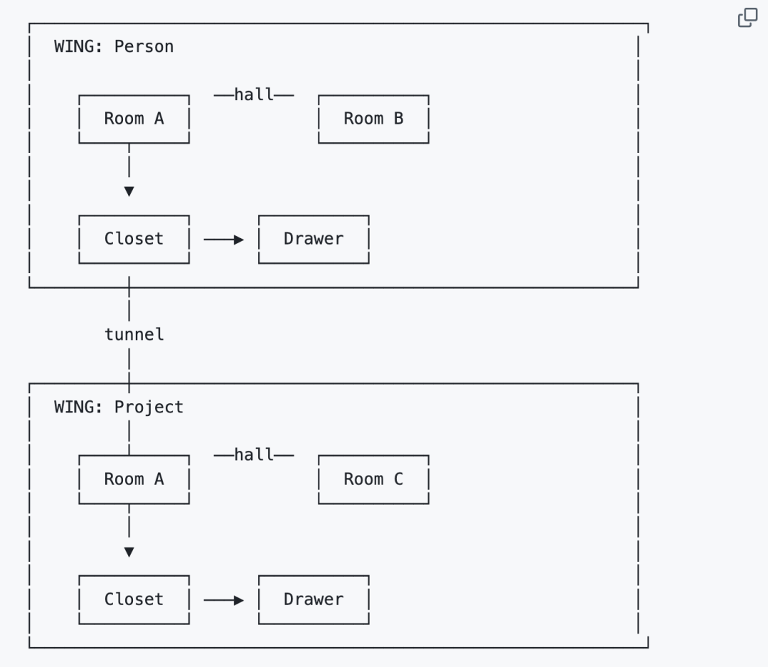 于是,MemPalace借鉴了《记忆宫殿》的技巧,直接将数据「结构化」,并构建出一个虚拟的空间: