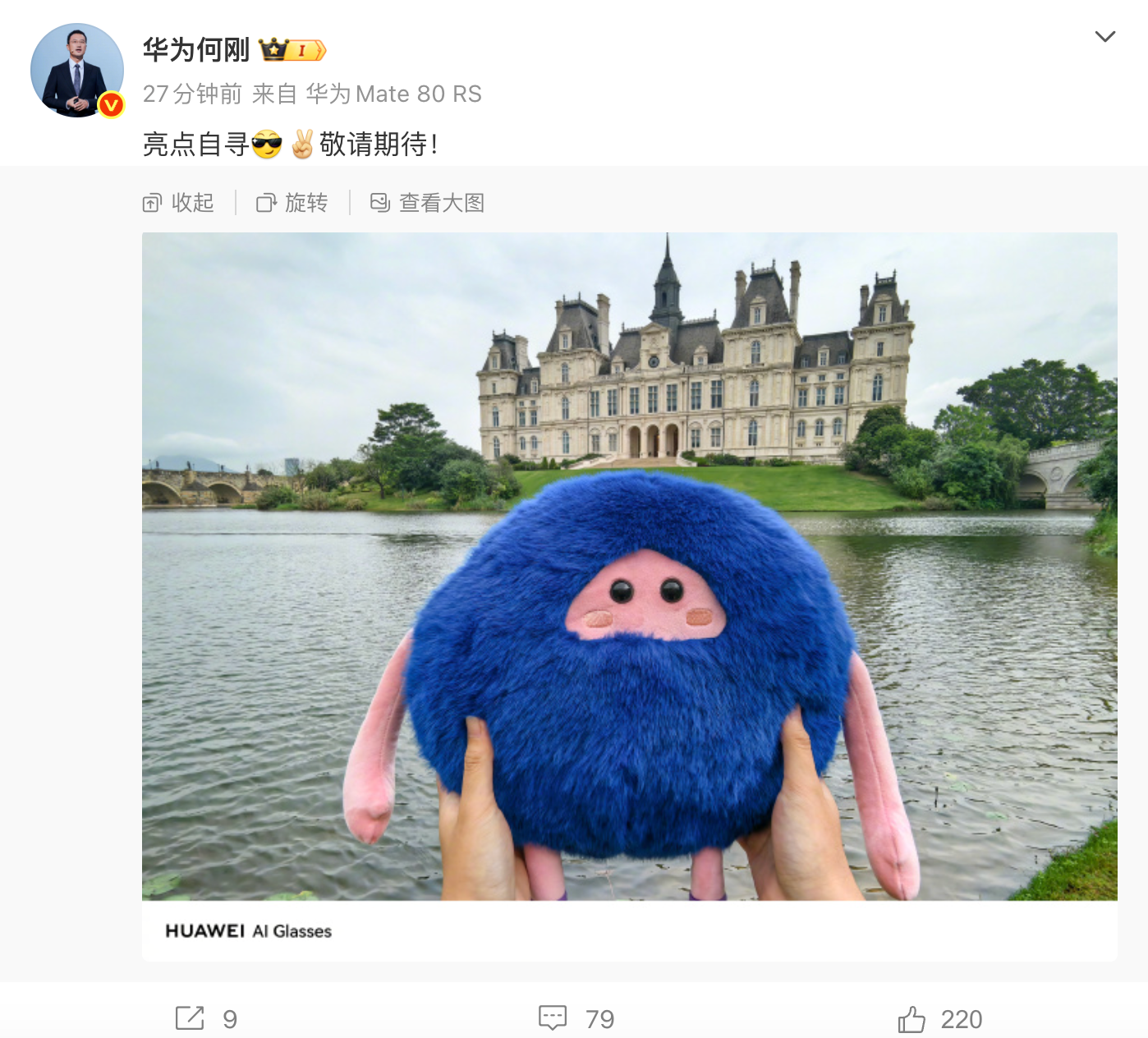 凤凰网科技讯 4月8日,华为终端BG首席执行官何刚分享了一张照片,其水印显示拍摄机型为“HUAWEI AI Glasses”。此举暗示了华为AI眼镜新品或将亮相。