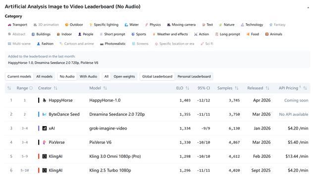 智东西4月8日报道,上周,AI视频生成领域盲测平台Artificial Analysis的榜首出现了一个匿名模型——HappyHorse(快乐小马),该模型在文生视频和图生视频两条赛道的无音频类别中同时登顶,将此前霸榜的字节跳动Seedance 2.0挤到了第二位。