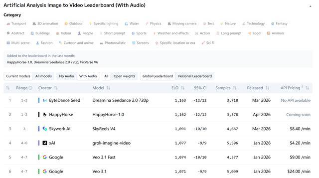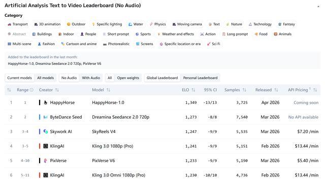 HappyHorse 1.0在该平台榜单上的表现如下: