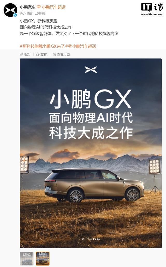 据介绍,小鹏 GX 定位“新科技旗舰”,号称面向物理 AI 时代科技大成之作,定义了下一个时代的科技旗舰高度。