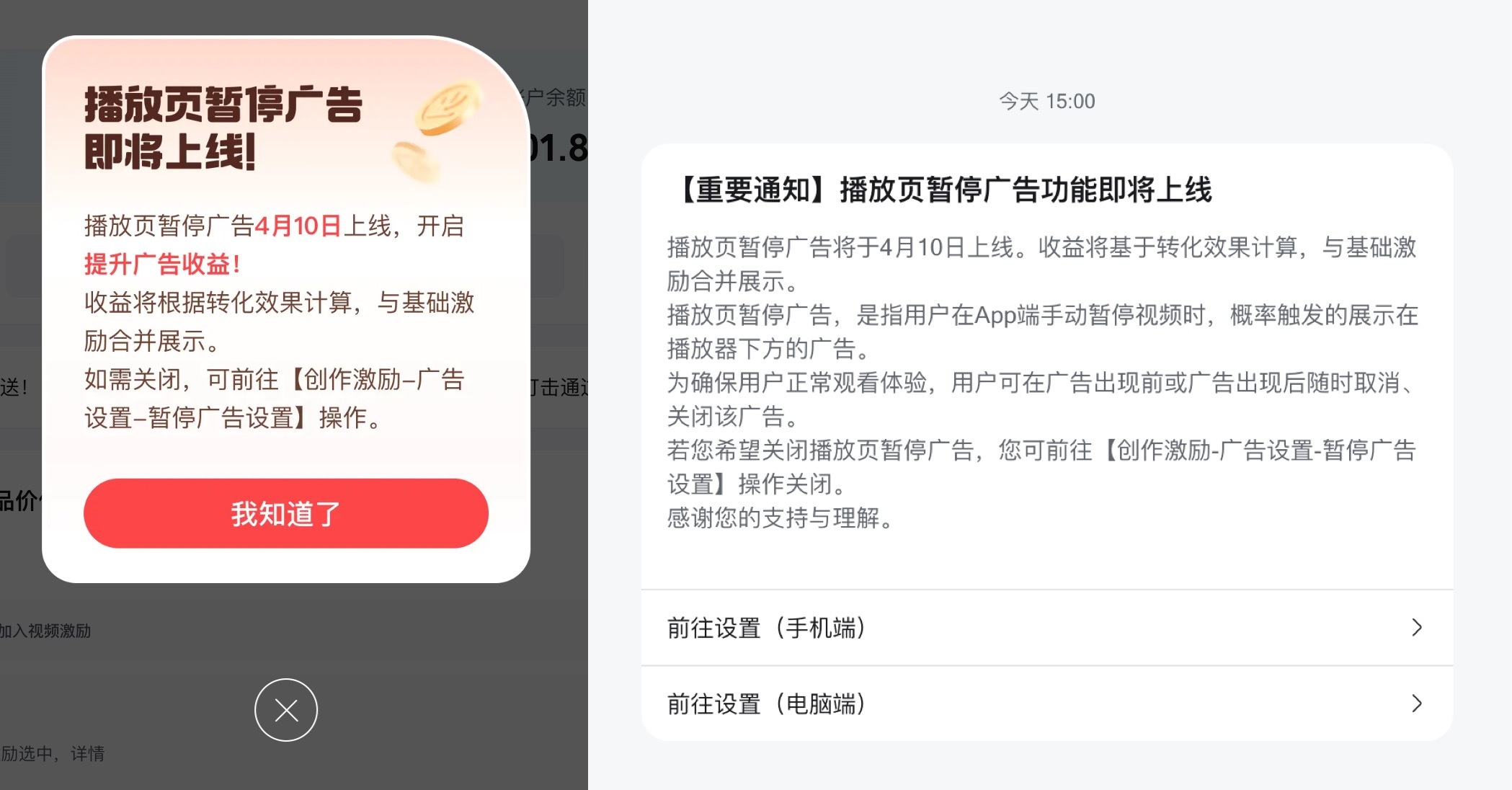 收益方面,暂停广告的收益将基于转化效果计算,并与 UP 主现有基础激励合并展示。对于不希望参与该广告形式的 UP 主,B 站提供了自主关闭选项,操作路径为【创作激励 – 广告设置 – 暂停广告设置】。
