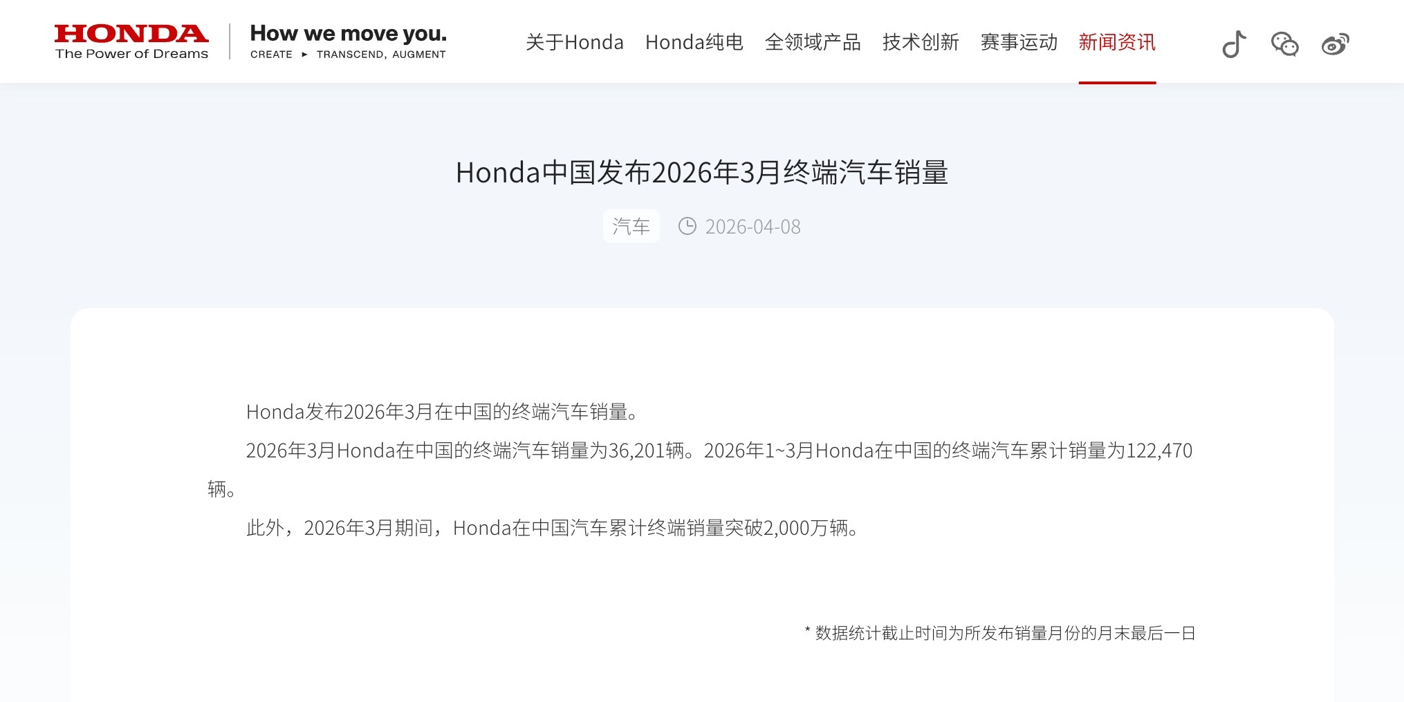 昨天,本田中国发布 2026 年 3 月在中国的终端汽车销量数据。数据显示,2026 年 3 月本田在中国的终端汽车销量为 36201 辆,2026 年 1 至 3 月累计销量为 122470 辆。