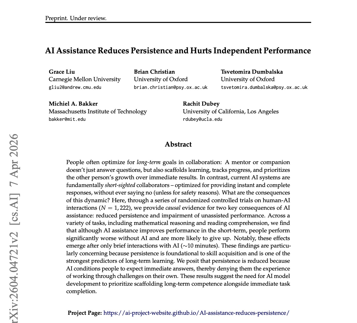 近日,来自卡内基梅隆大学、牛津大学、MIT 及加州大学洛杉矶分校的联合团队发布了一篇最新研究成果,通过迄今最大规模的随机对照实验提供因果证据:使用AI辅助解题,不仅让人独立解题能力下滑,还会让人更快放弃思考。