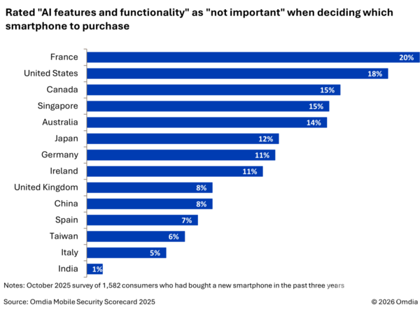 消费者对智能手机AI功能的态度因地区而异。市场表现出最怀疑态度的包括法国(20%)和美国(18%),在这些市场中,认为AI功能“完全不重要”的比例高于其他国家。相反,印度(1%)和西班牙(7%)的消费者对AI功能的怀疑较少,甚至表现出更高的兴趣。其中,25%的印度受访者表示AI功能对其购买决策至关重要。