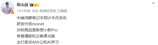 【CNMO科技消息】近日,有数码博主爆料称,华为预计将于本月发布一款定位中端的鸿蒙笔记本电脑。CNMO获悉,该产品研发代号为monet(莫奈),将提供普通版和云晰柔光版两种屏幕配置选项,核心卖点聚焦于AI办公与AI学习场景。
