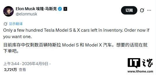 IT之家 4 月 9 日消息,埃隆 · 马斯克刚刚就特斯拉 Model S 与 Model X 库存问题抛出最新消息,随着公司逐步停产这两款旗舰车型,如今购买全新车辆的机会几乎所剩无几。