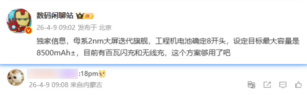 【CNMO科技消息】4月9日,数码博主“数码闲聊站”爆料称,一款母系大屏旗舰手机的工程机确认搭载8k级别大电池,设定最大容量为8500mAh左右。并且,该机还将支持百瓦闪充和无线充。根据网友猜测,这款新机可能是小米18 Pro Max。