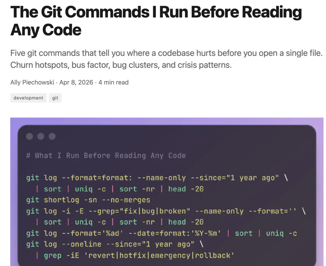 作者 Ally Piechowski 认为,对于一个新的代码库,打开终端,运行一组 Git 命令,在查看任何文件之前,「提交历史」就能给出一幅关于这个项目的「诊断图」:是谁构建了它、问题集中在哪些地方、团队是自信满满地交付,还是在雷区边缘小心试探……