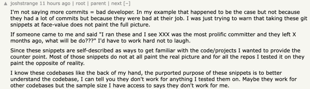 还有网友认为,这种方法是在过度解读 Git 数据,Git 分析并不总是等于真相,很容易误导判断。