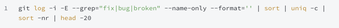 这一命令的结构与 churn 分析类似,但只筛选包含 Bug 关键词的提交。将这个列表与前面的 churn 热点做对比,两个列表都出现的文件,就是最高风险代码:它们不断出问题、不断被修补,但从未被彻底解决。