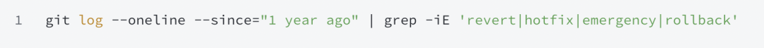 这一命令是查看「回滚」(revert)与「热修复」(hotfix)的频率。一年内偶尔几次是正常的,但如果每隔几周就有一次「回滚」,说明团队并不信任自己的发布流程,而这通常意味着更深层的问题:测试不可靠、缺乏预发布环境(staging),或者部署流程让「回滚」变得困难。